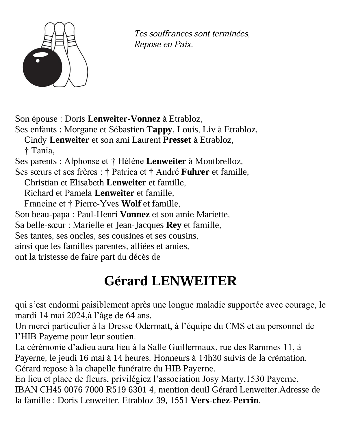 Monsieur Gérard LENWEITER 22 fév. 1960 - 14 mai. 2024 Avis mortuaire PFG Télecharger PDF Partager sur: Galerie