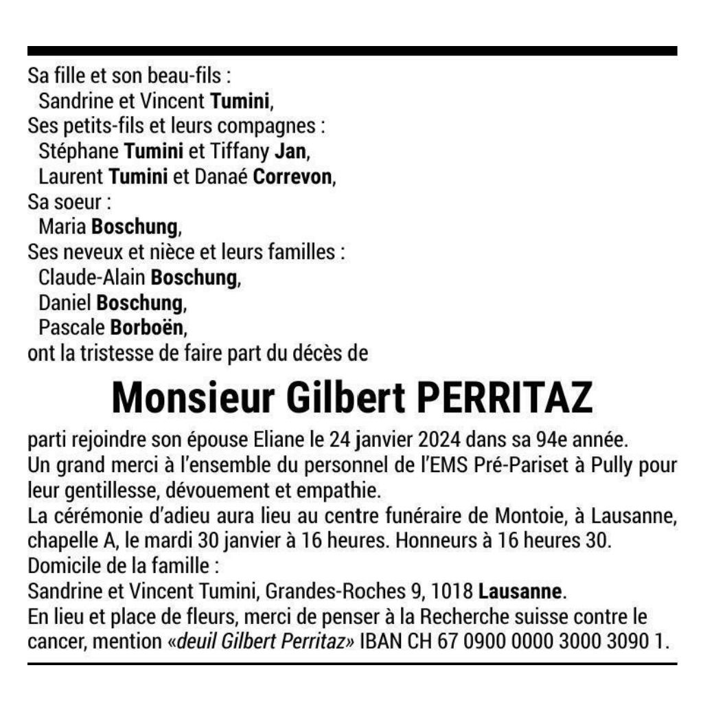 Monsieur Gilbert PERRITAZ 27 juin. 1930 - 24 jan. 2024 Avis mortuaire PFG Télecharger PDF Partager sur: Galerie PreviousNext PreviousNext