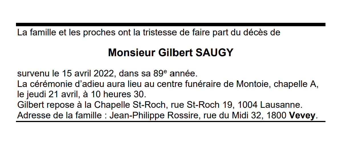 Monsieur Gilbert SAUGY 21 juin. 1933 - 15 avr. 2022 Avis mortuaire PFG Télecharger PDF Partager sur: Galerie PreviousNext PreviousNext