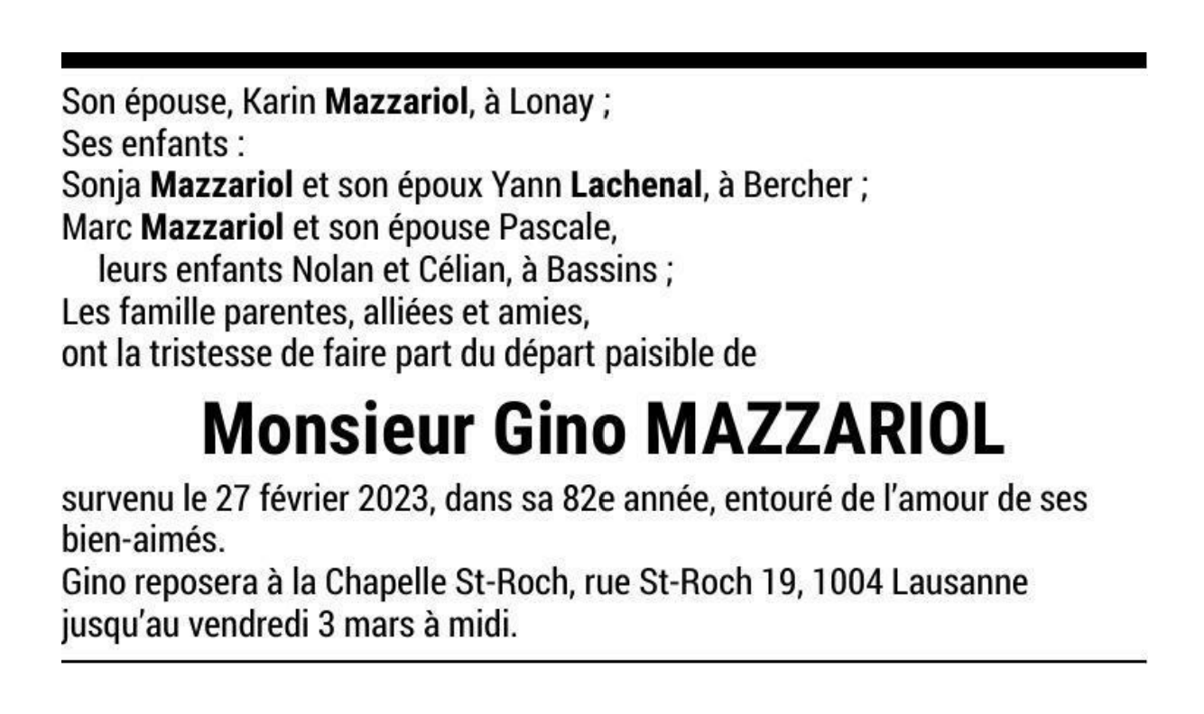 Monsieur Gino MAZZARIOL 11 nov. 1941 - 27 fév. 2023 Avis mortuaire PFG Télecharger PDF Partager sur: Galerie PreviousNext PreviousNext