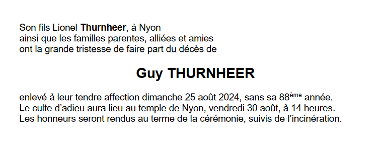 Monsieur Guy THURNHEER 07 sep. 1936 - 25 aoû. 2024 Avis mortuaire PFG Télecharger PDF Partager sur: Galerie PreviousNext PreviousNext