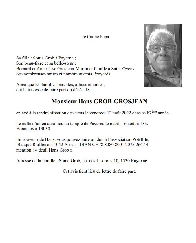 Monsieur Hans GROB-GROSJEAN 28 déc. 1935 - 12 aoû. 2022 Avis mortuaire PFG Télecharger PDF Partager sur: Galerie PreviousNext PreviousNext