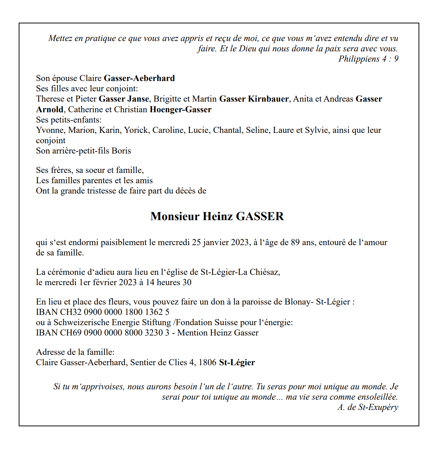 Monsieur Heinz GASSER 05 aoû. 1933 - 25 jan. 2023 Avis mortuaire PFG Télecharger PDF Partager sur: Galerie PreviousNext PreviousNext