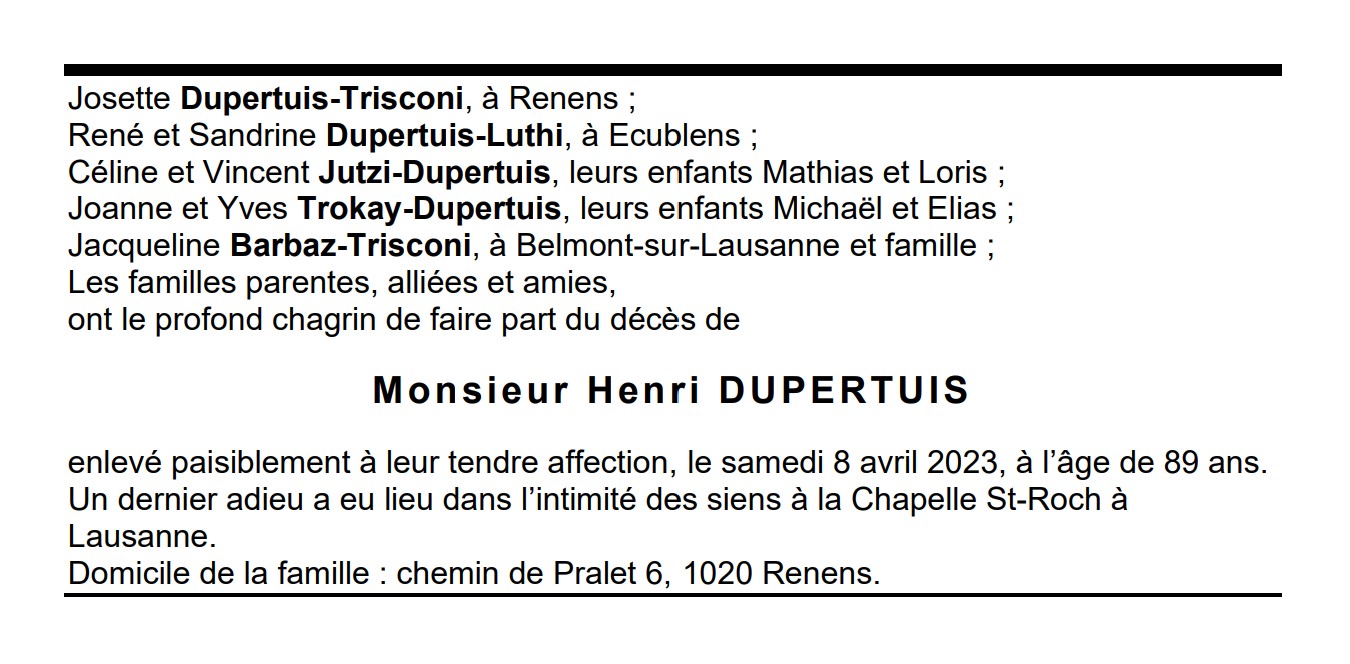 Monsieur Henri DUPERTUIS 15 mar. 1934 - 08 avr. 2023 Avis mortuaire PFG Télecharger PDF Partager sur: Galerie PreviousNext PreviousNext