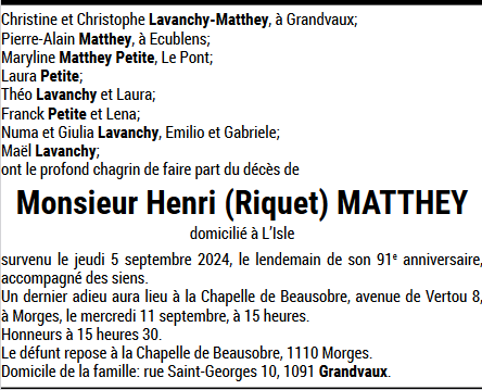 Monsieur Henri MATTHEY 04 sep. 1933 - 05 sep. 2024 Avis mortuaire PFG Télecharger PDF Partager sur: Galerie
