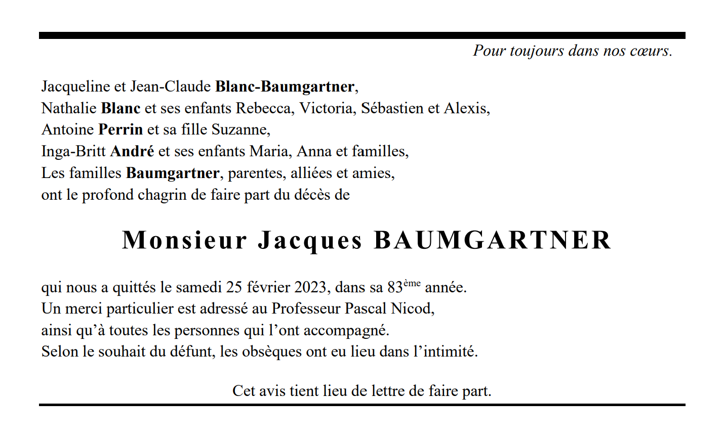 Monsieur Jacques BAUMGARTNER 10 déc. 1940 - 25 fév. 2023 Avis mortuaire PFG Télecharger PDF Partager sur: Galerie PreviousNext PreviousNext