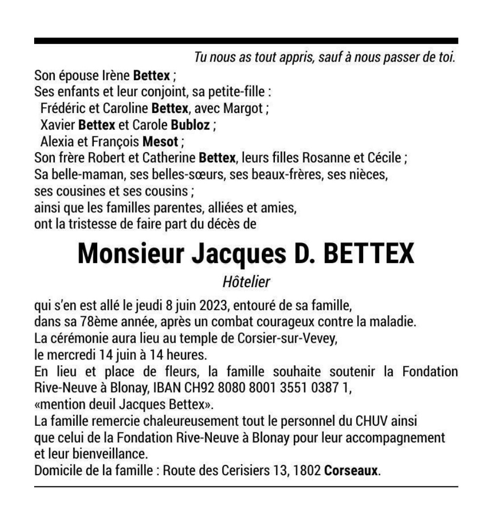 Monsieur Jacques D. BETTEX 21 nov. 1945 - 08 juin. 2023 Avis mortuaire PFG Télecharger PDF Partager sur: Galerie PreviousNext PreviousNext