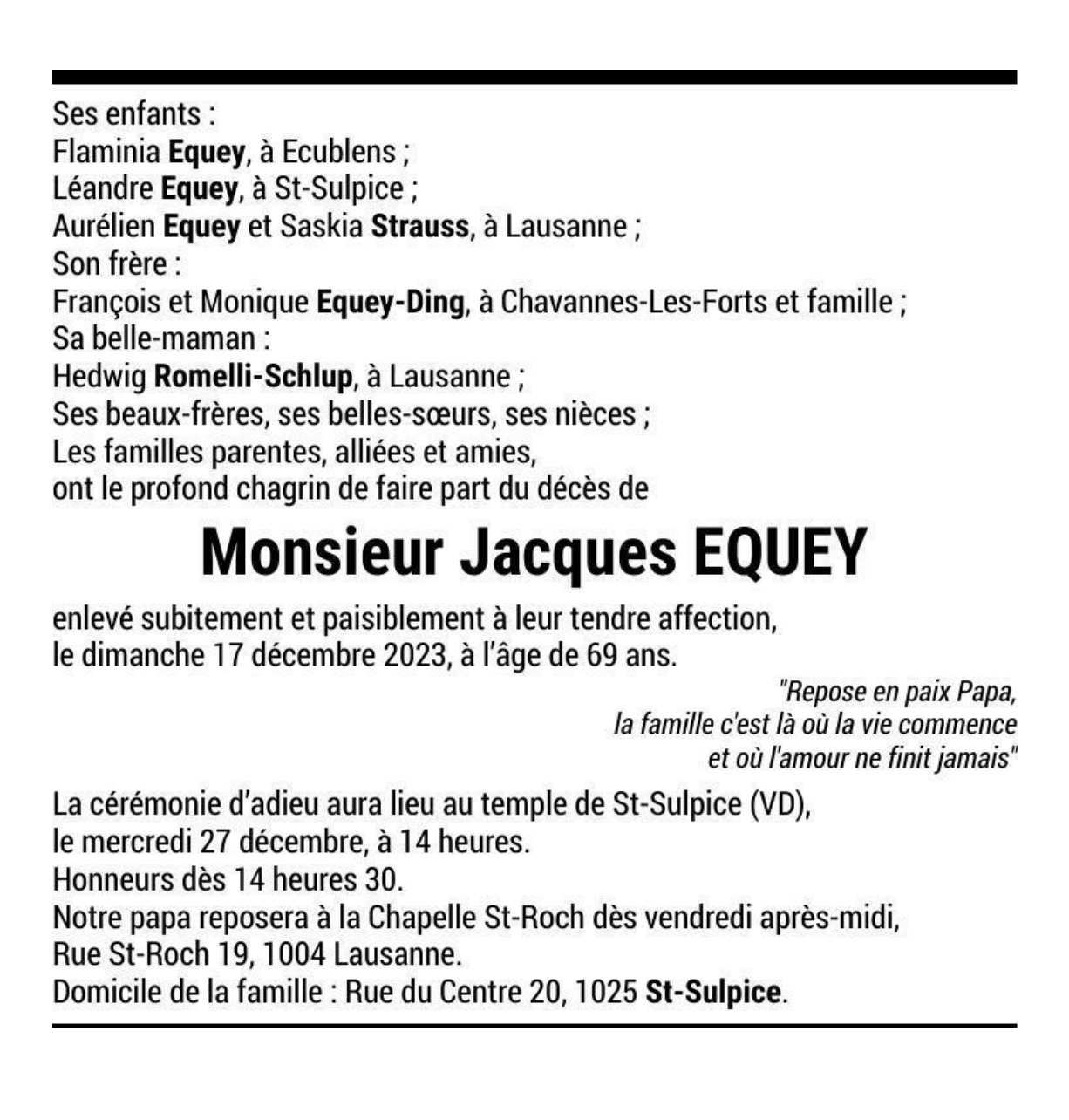 Monsieur Jacques EQUEY 02 sep. 1954 - 17 déc. 2023 Avis mortuaire PFG Télecharger PDF Partager sur: Galerie PreviousNext PreviousNext