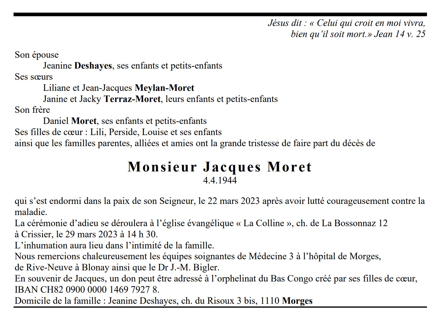 Monsieur Jacques Moret 04 avr. 1944 - 22 mar. 2023 Avis mortuaire PFG Télecharger PDF Partager sur: Galerie PreviousNext PreviousNext