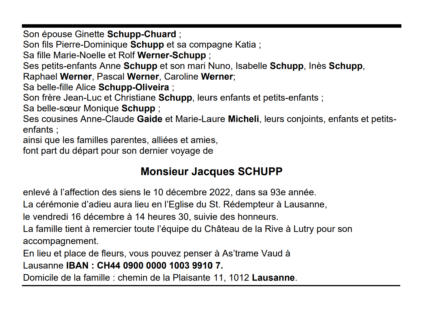Monsieur Jacques SCHUPP 05 nov. 1930 - 10 déc. 2022 Avis mortuaire PFG Télecharger PDF Partager sur: Galerie PreviousNext PreviousNext