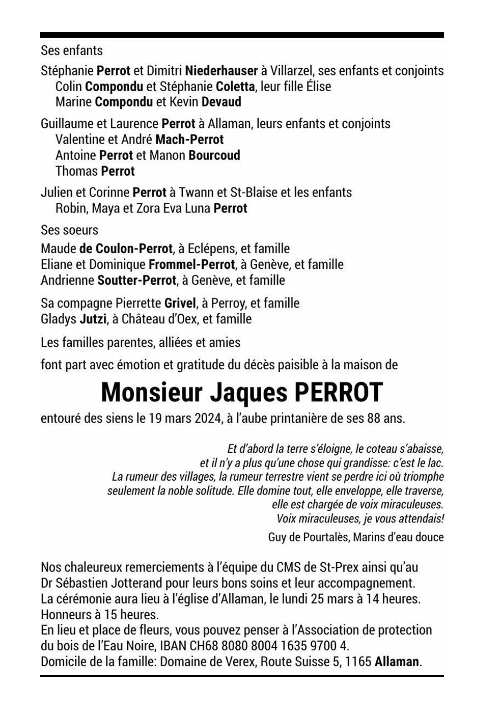 Monsieur Jaques PERROT 15 juin. 1936 - 19 mar. 2024 Avis mortuaire PFG Télecharger PDF Partager sur: Galerie PreviousNext PreviousNext