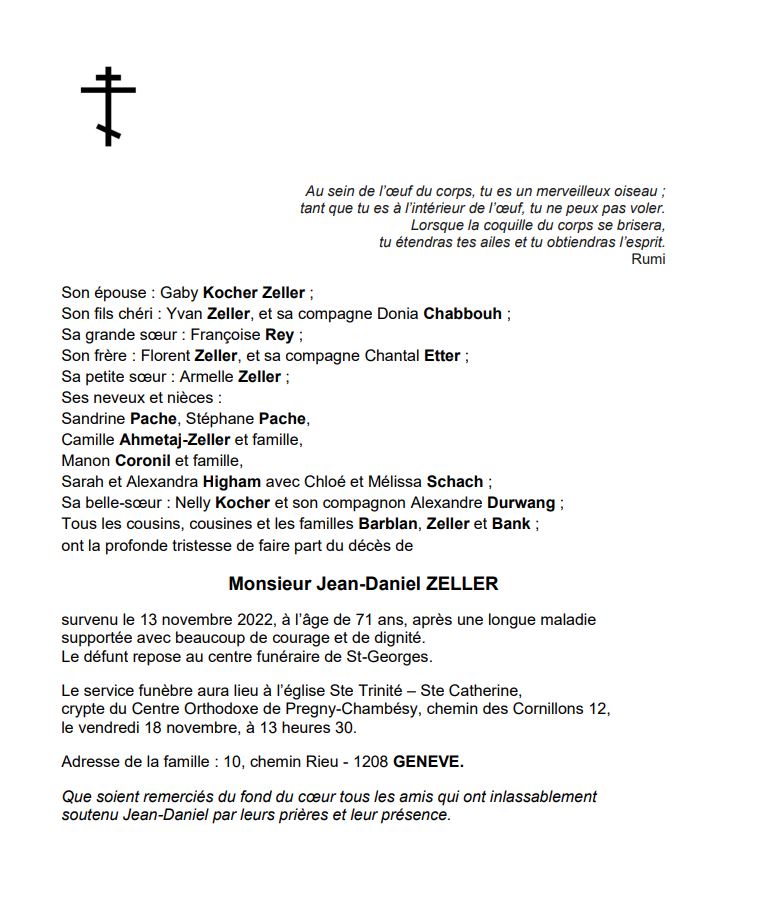 Monsieur Jean-Daniel ZELLER 24 jan. 1951 - 13 nov. 2022 Avis mortuaire PFG Télecharger PDF Partager sur: Galerie PreviousNext PreviousNext