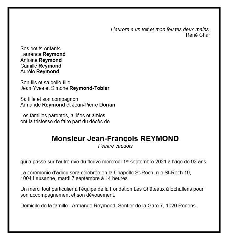 Monsieur Jean-François REYMOND 25 jan. 1929 - 01 sep. 2021 Avis mortuaire PFG Télecharger PDF Partager sur: Galerie PreviousNext PreviousNext