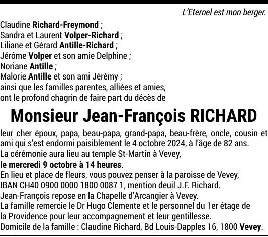Monsieur Jean-François RICHARD 05 avr. 1942 - 04 oct. 2024 Avis mortuaire PFG Partager sur: Galerie PreviousNext PreviousNext