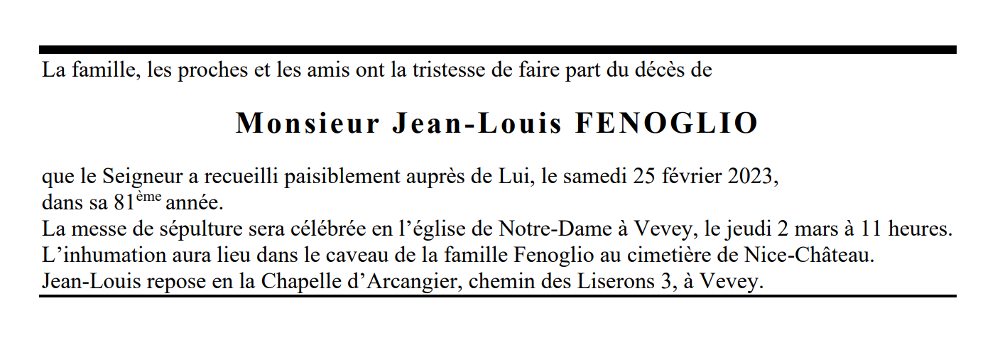 Monsieur Jean-Louis FENOGLIO 20 juin. 1942 - 25 fév. 2023 Avis mortuaire PFG Télecharger PDF Partager sur: Galerie PreviousNext PreviousNext