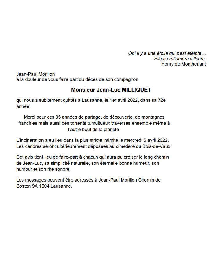 Monsieur Jean-Luc MILLIQUET 25 mai. 1949 - 01 avr. 2022 Avis mortuaire PFG Télecharger PDF Partager sur: Galerie PreviousNext PreviousNext