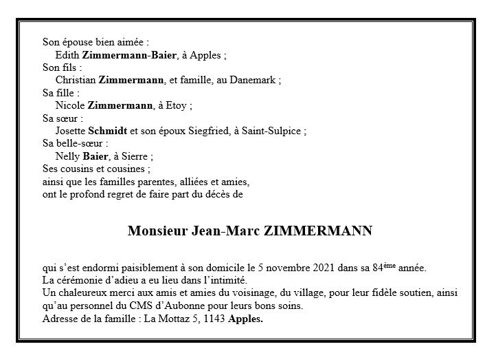 Monsieur Jean-Marc ZIMMERMANN 02 juin. 1938 - 05 nov. 2021 Avis mortuaire PFG Télecharger PDF Partager sur: Galerie PreviousNext PreviousNext