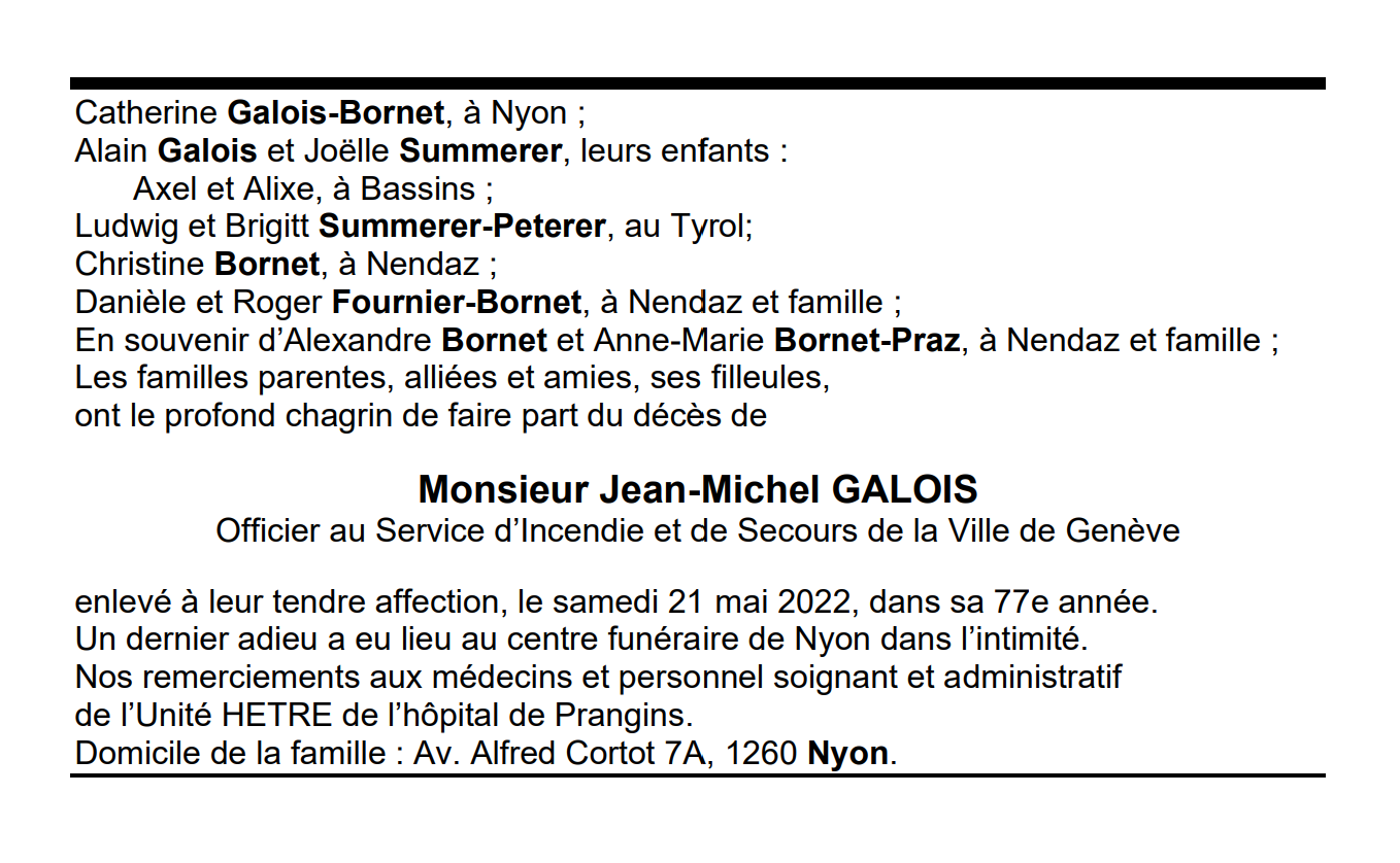 Monsieur Jean-Michel GALOIS 18 sep. 1945 - 21 mai. 2022 Avis mortuaire PFG Télecharger PDF Partager sur: Galerie PreviousNext PreviousNext