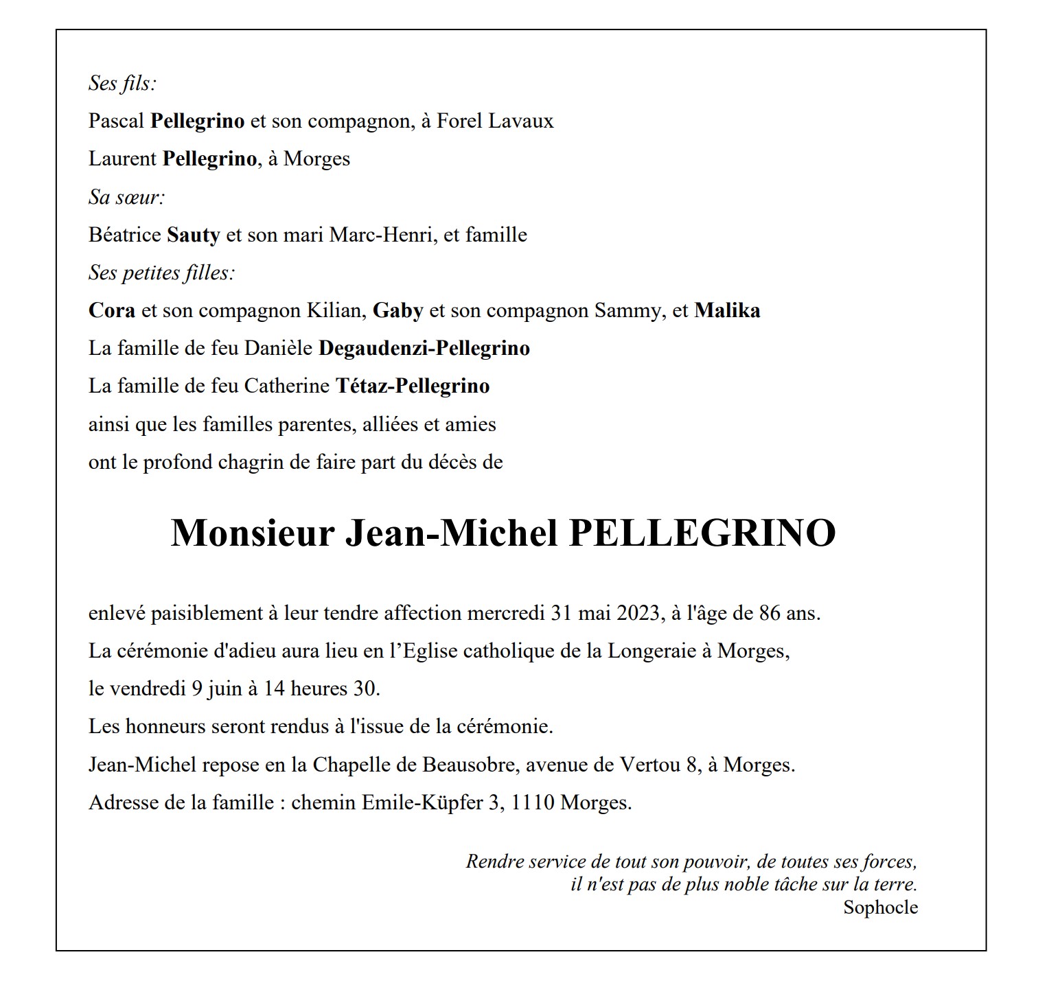 Monsieur Jean-Michel PELLEGRINO 20 fév. 1937 - 31 mai. 2023 Avis mortuaire PFG Télecharger PDF Partager sur: Galerie PreviousNext PreviousNext