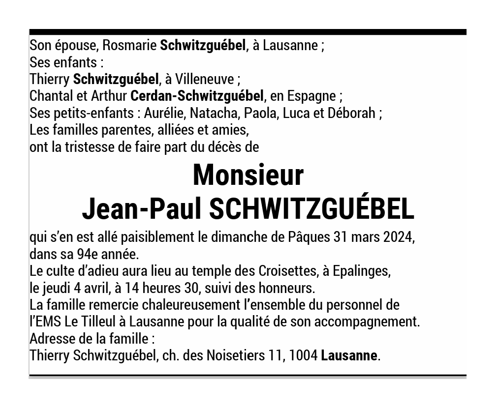 Monsieur Jean-Paul SCHWITZGUÉBEL 08 sep. 1930 - 31 mar. 2024 Avis mortuaire PFG Télecharger PDF Partager sur: Galerie PreviousNext PreviousNext
