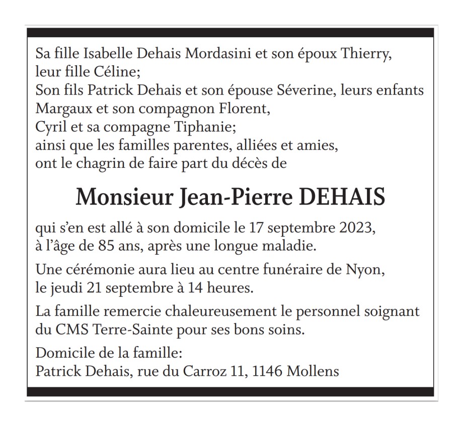 Monsieur Jean-Pierre DEHAIS 03 avr. 1938 - 17 sep. 2023 Avis mortuaire PFG Télecharger PDF Partager sur: Galerie PreviousNext PreviousNext
