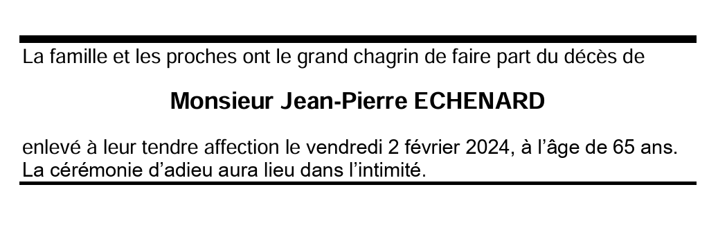 Monsieur Jean-Pierre ECHENARD 05 nov. 1958 - 02 fév. 2024 Avis mortuaire PFG Télecharger PDF Partager sur: Galerie PreviousNext PreviousNext
