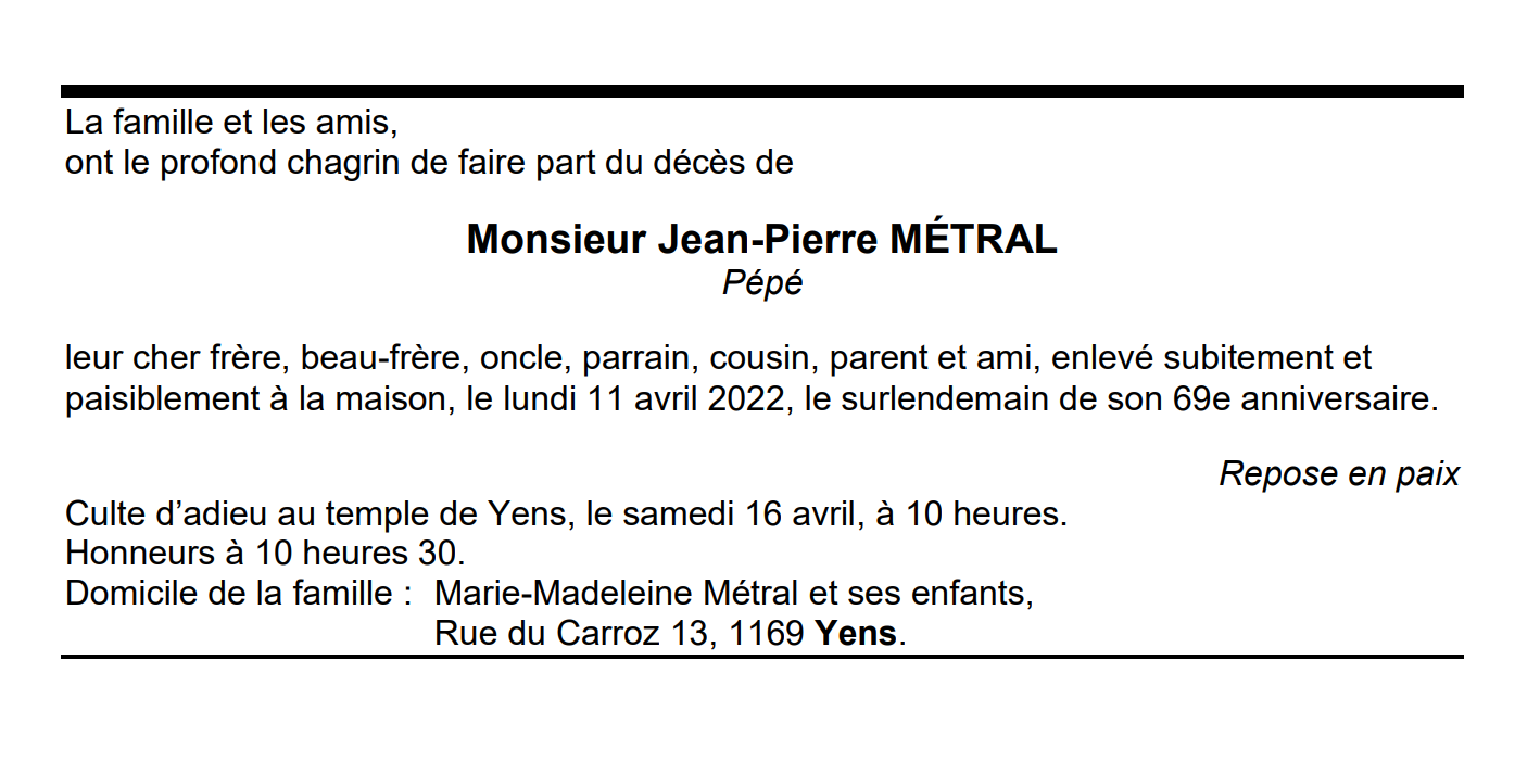 Monsieur Jean-Pierre MÉTRAL 09 avr. 1953 - 11 avr. 2022 Avis mortuaire PFG Télecharger PDF Partager sur: Galerie PreviousNext PreviousNext