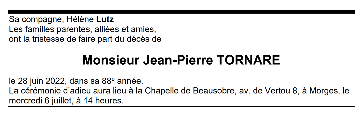 Monsieur Jean-Pierre TORNARE 14 sep. 1934 - 28 juin. 2022 Avis mortuaire PFG Télecharger PDF Partager sur: Galerie PreviousNext PreviousNext