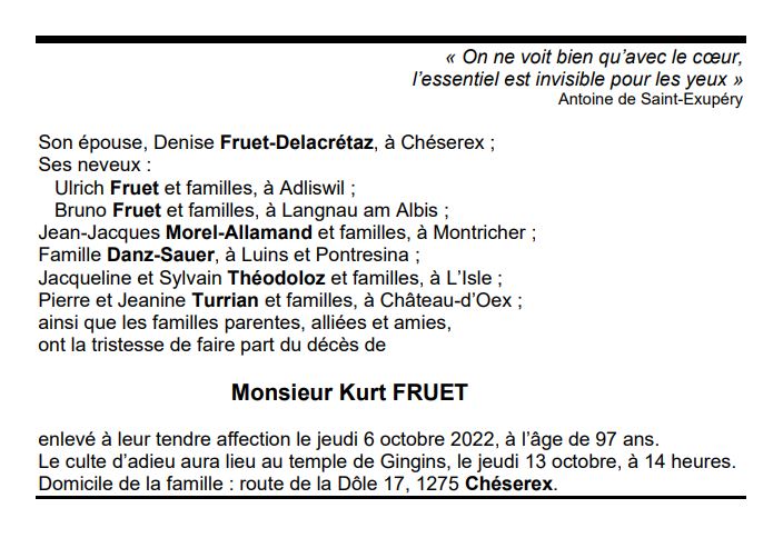 Monsieur Kurt FRUET 27 juin. 1925 - 06 oct. 2022 Avis mortuaire PFG Télecharger PDF Partager sur: Galerie PreviousNext PreviousNext