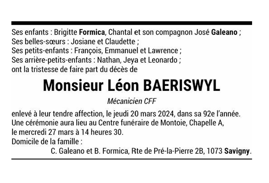Monsieur Léon BAERISWYL 25 nov. 1932 - 20 mar. 2024 Avis mortuaire PFG Télecharger PDF Partager sur: Galerie PreviousNext PreviousNext