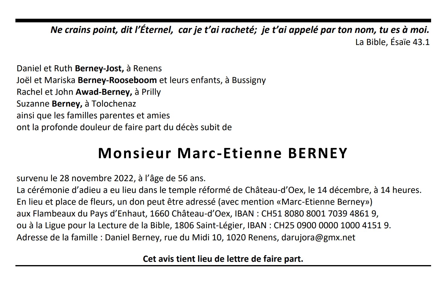 Monsieur Marc-Etienne BERNEY 15 jan. 1966 - 28 nov. 2022 Avis mortuaire PFG Télecharger PDF Partager sur: Galerie PreviousNext PreviousNext