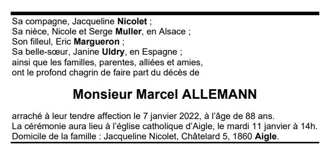 Monsieur Marcel ALLEMANN 09 nov. 1933 - 07 jan. 2022 Avis mortuaire PFG Télecharger PDF Partager sur: Galerie PreviousNext PreviousNext