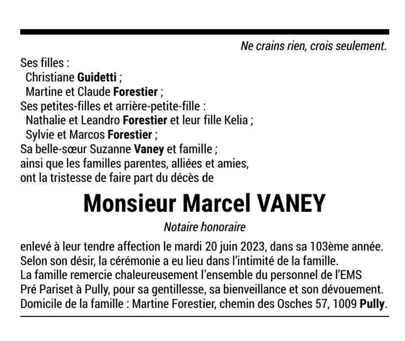 Monsieur Marcel VANEY 23 aoû. 1920 - 20 juin. 2023 Avis mortuaire PFG Télecharger PDF Partager sur: Galerie PreviousNext PreviousNext