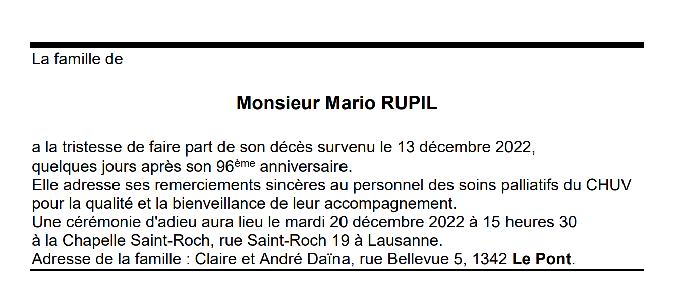 Monsieur Mario RUPIL 08 déc. 1926 - 13 déc. 2022 Avis mortuaire PFG Télecharger PDF Partager sur: Galerie PreviousNext PreviousNext