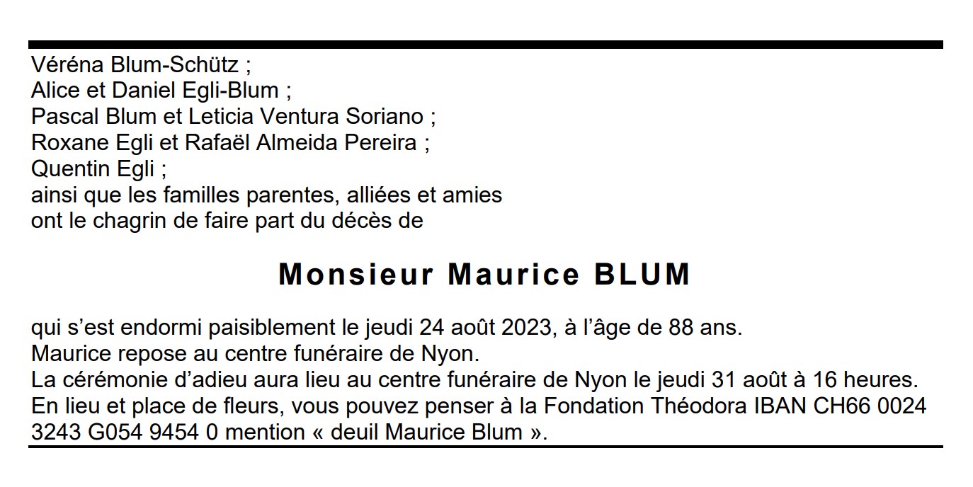Monsieur Maurice BLUM 01 mar. 1935 - 24 aoû. 2023 Avis mortuaire PFG Télecharger PDF Partager sur: Galerie PreviousNext PreviousNext