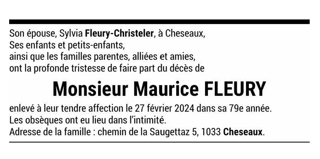 Monsieur Maurice FLEURY 29 juin. 1945 - 27 fév. 2024 Avis mortuaire PFG Télecharger PDF Partager sur: Galerie PreviousNext PreviousNext