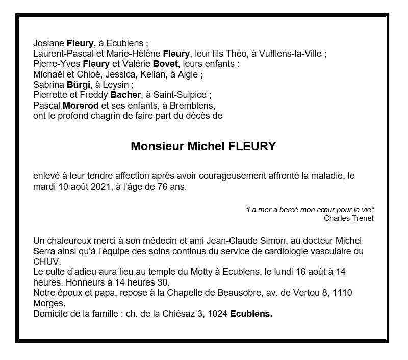 Monsieur Michel FLEURY 28 avr. 1945 - 10 aoû. 2021 Avis mortuaire PFG Télecharger PDF Partager sur: Galerie PreviousNext PreviousNext
