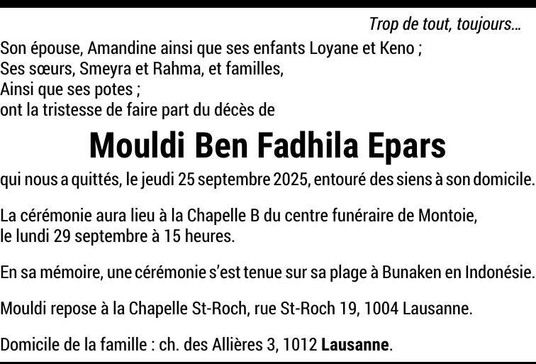 Monsieur Mouldi Ben Fadhila Epars 21 sep. 1963 - 25 sep. 2025 Avis mortuaire PFG Partager sur: Galerie