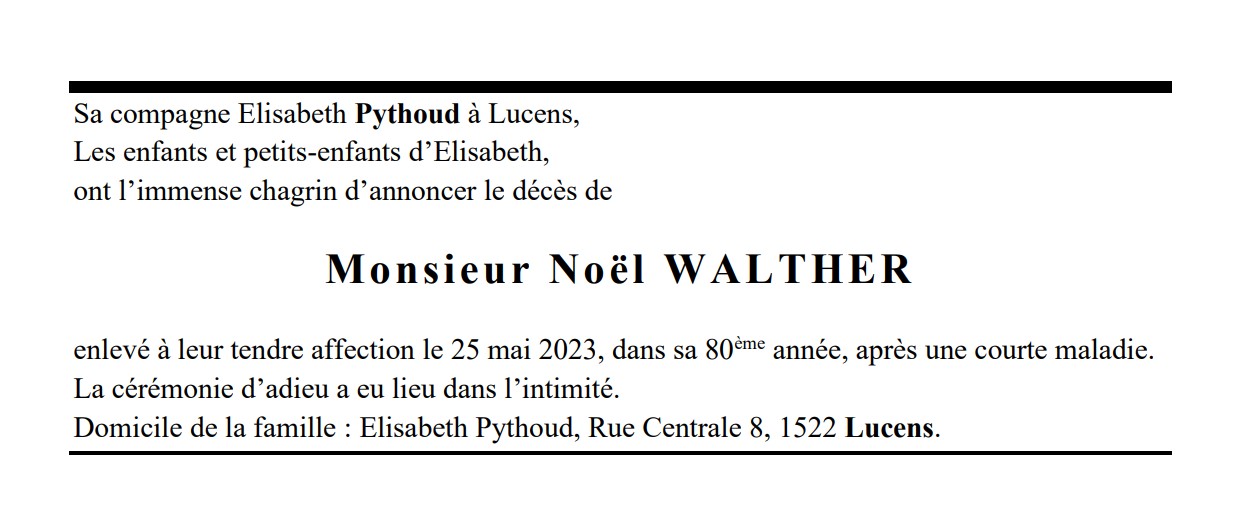 Monsieur Noël WALTHER 26 déc. 1943 - 25 mai. 2023 Avis mortuaire PFG Télecharger PDF Partager sur: Galerie