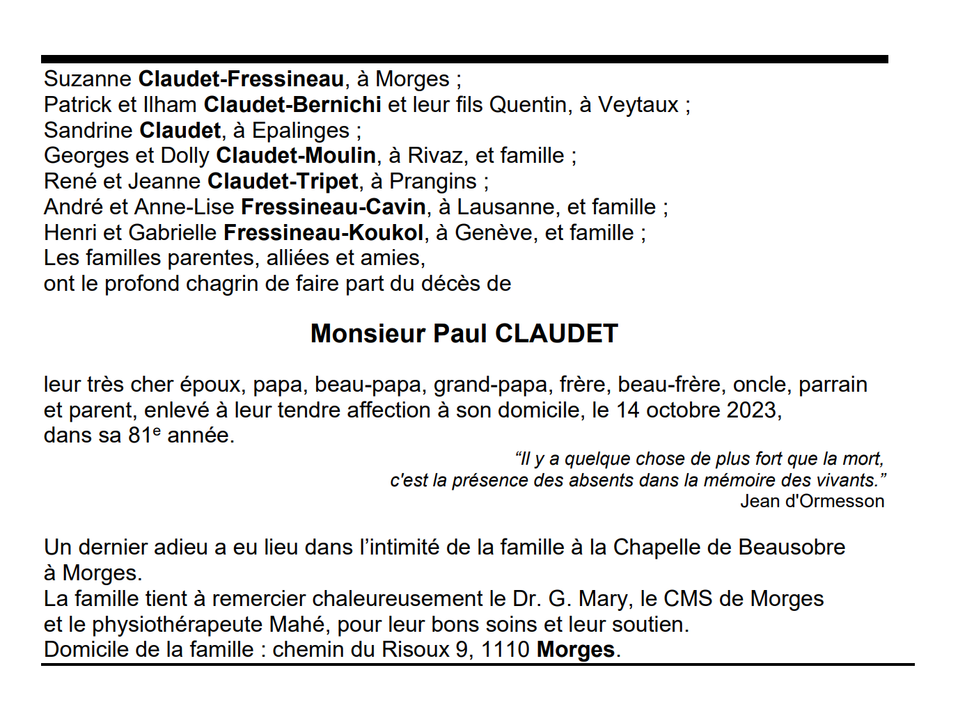 Monsieur Paul CLAUDET 30 avr. 1943 - 14 oct. 2023 Avis mortuaire PFG Télecharger PDF Partager sur: Galerie PreviousNext PreviousNext