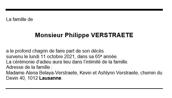 Monsieur Philippe VERSTRAETE 16 sep. 1957 - 11 oct. 2021 Avis mortuaire PFG Télecharger PDF Partager sur: Galerie PreviousNext PreviousNext