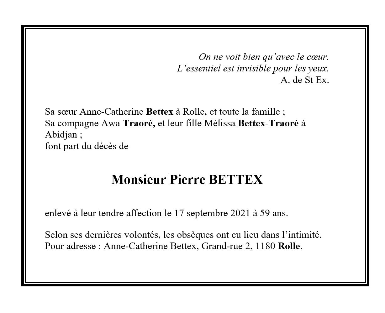 Monsieur Pierre BETTEX 18 mai. 1962 - 17 sep. 2021 Avis mortuaire PFG Télecharger PDF Partager sur: Galerie