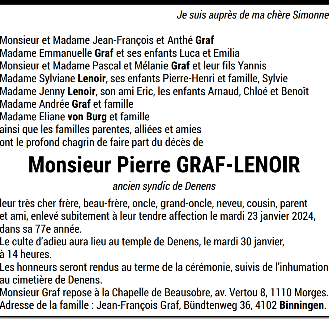 Monsieur Pierre GRAF-LENOIR 26 juin. 1947 - 23 jan. 2024 Avis mortuaire PFG Télecharger PDF Partager sur: Galerie PreviousNext PreviousNext