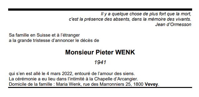 Monsieur Pieter WENK 09 mai. 1941 - 04 mar. 2022 Avis mortuaire PFG Télecharger PDF Partager sur: Galerie PreviousNext PreviousNext