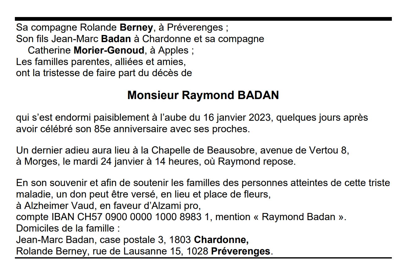 Monsieur Raymond BADAN 08 jan. 1938 - 16 jan. 2023 Avis mortuaire PFG Télecharger PDF Partager sur: Galerie PreviousNext PreviousNext