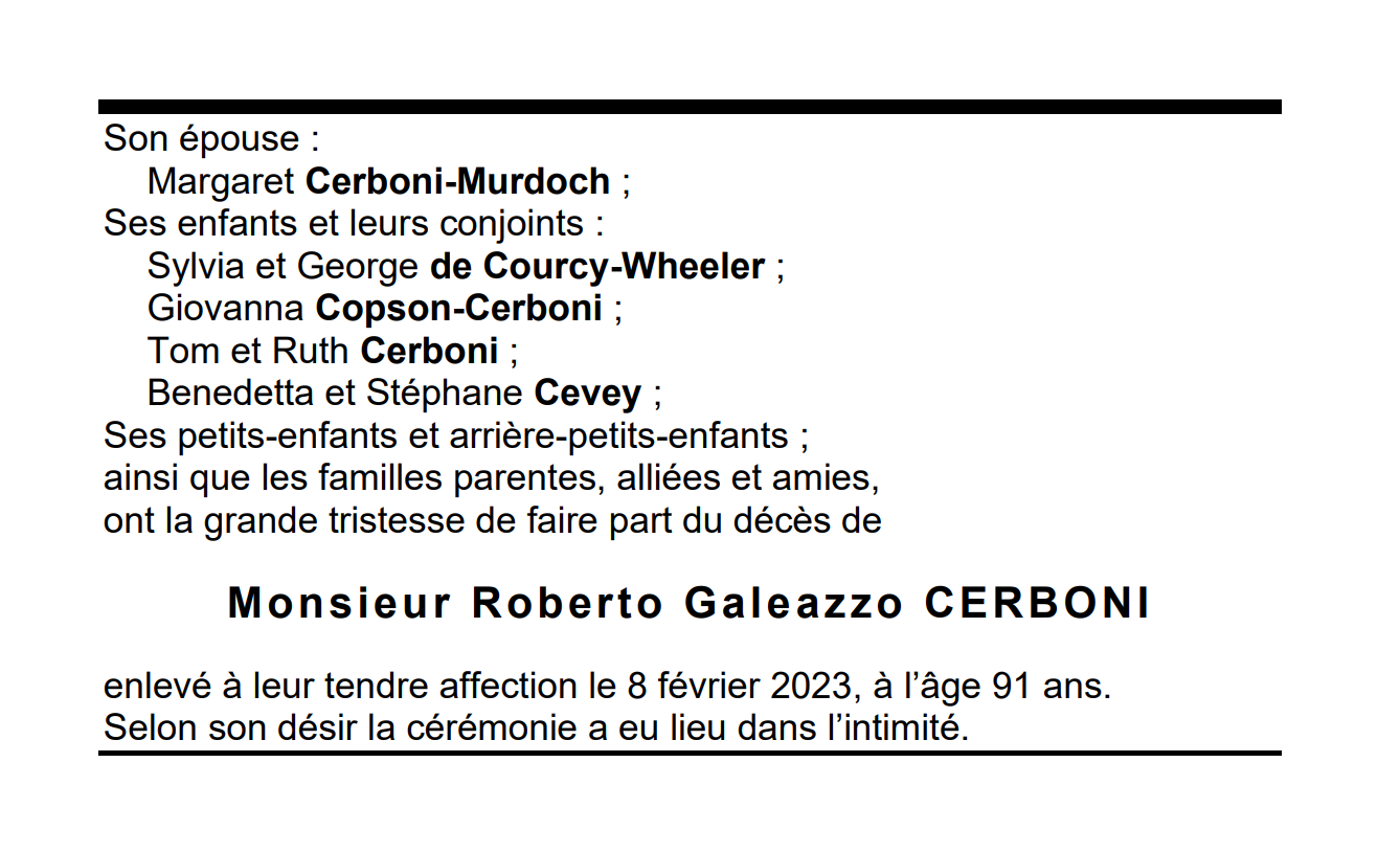 Monsieur Roberto Galeazzo CERBONI 08 aoû. 1931 - 08 fév. 2023 Avis mortuaire PFG Télecharger PDF Partager sur: Galerie PreviousNext PreviousNext