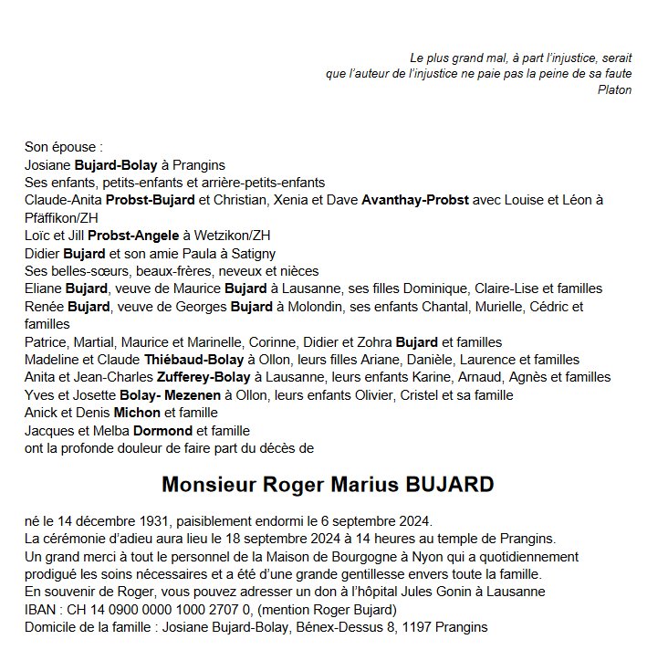 Monsieur Roger Marius BUJARD 14 déc. 1931 - 06 sep. 2024 Avis mortuaire PFG Télecharger PDF Partager sur: Galerie PreviousNext PreviousNext