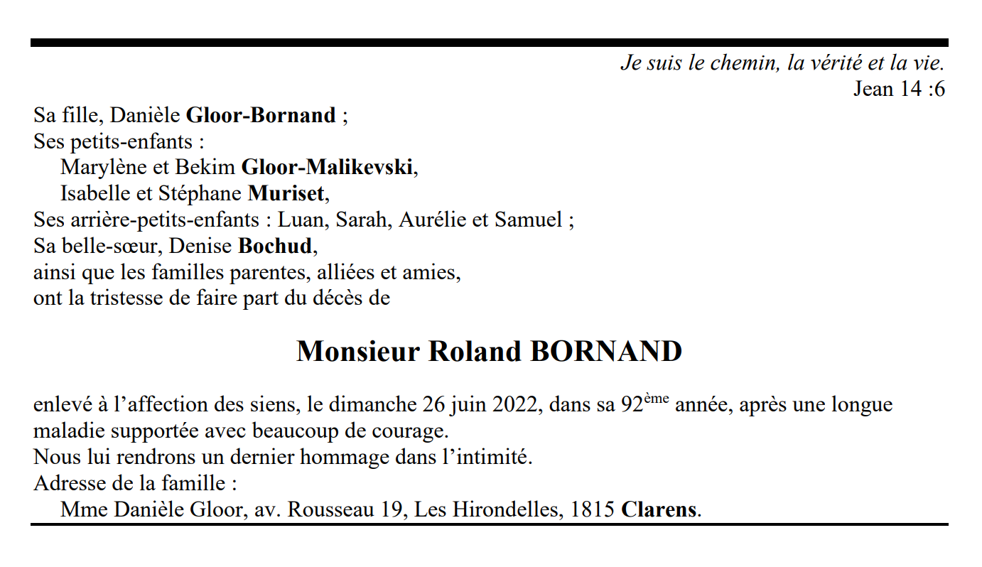Monsieur Roland BORNAND 13 déc. 1930 - 26 juin. 2022 Avis mortuaire PFG Télecharger PDF Partager sur: Galerie PreviousNext PreviousNext