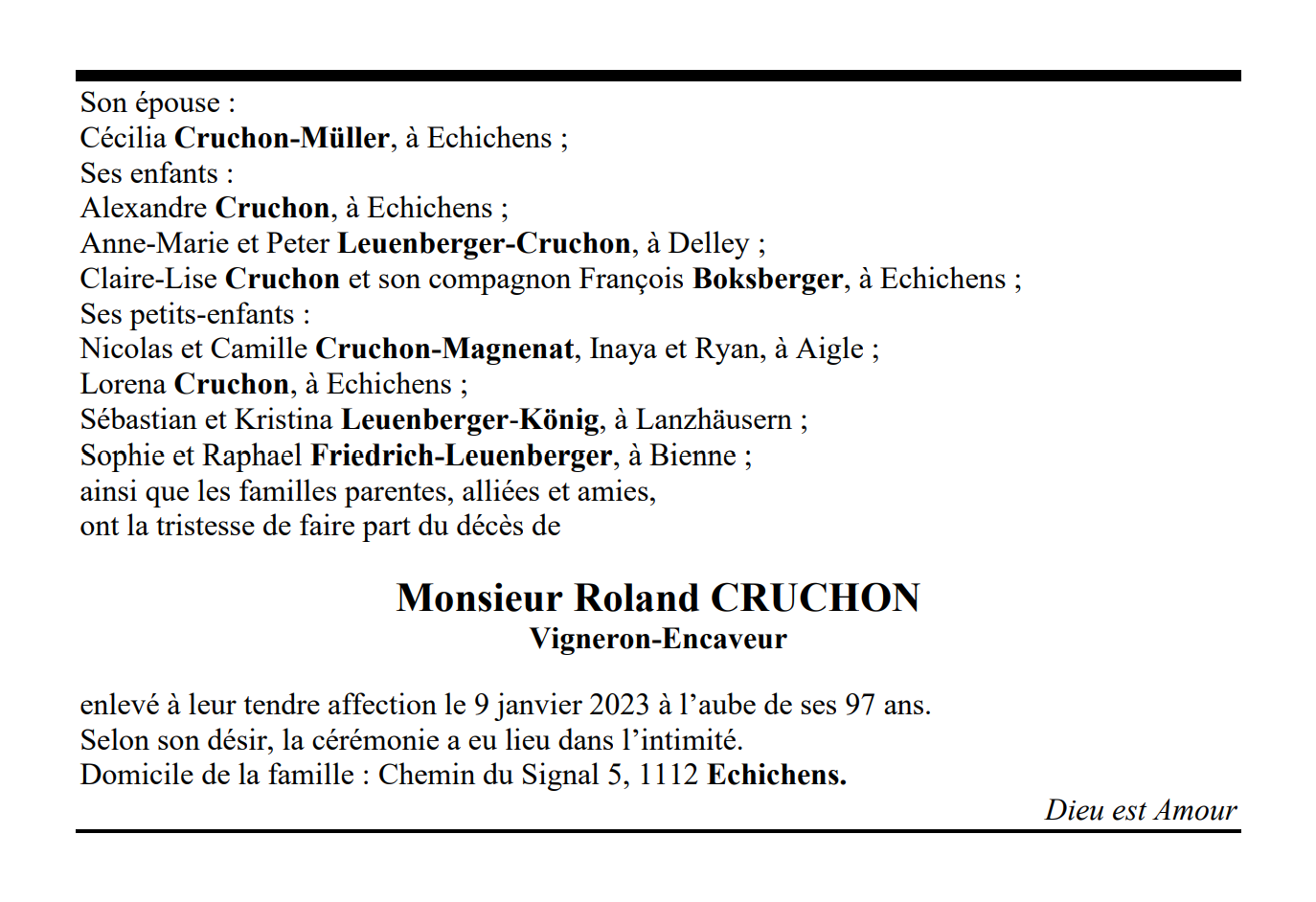 Monsieur Roland CRUCHON 13 fév. 1926 - 09 jan. 2023 Avis mortuaire PFG Télecharger PDF Partager sur: Galerie PreviousNext PreviousNext