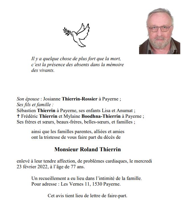 Monsieur Roland Thierrin 01 fév. 1945 - 23 fév. 2022 Avis mortuaire PFG Télecharger PDF Partager sur: Galerie PreviousNext PreviousNext